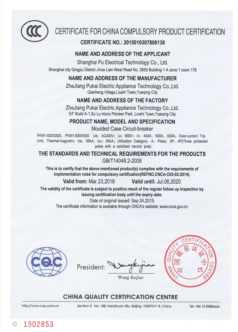 PKM1-630塑壳断路器英文证书